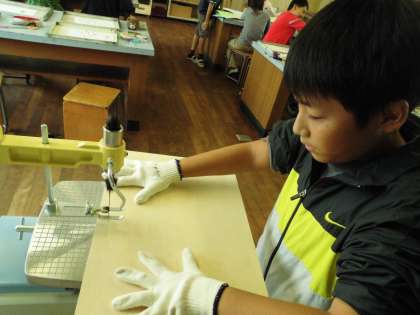 図工では電動のこぎりを使って立体作品にチャレンジします。