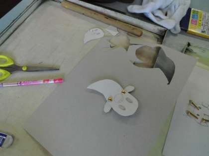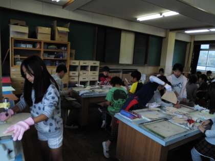 電動のこぎりは4台しかないので,待っている間はアニメーションづくりにトライしています。ボール紙を割りピンでつなぎ,動くキャラクターを作っています。