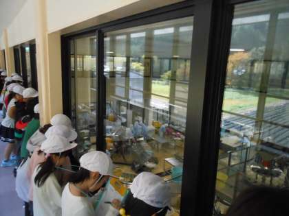 はじめは「土井のしば漬け」工場を見学させていただきました。自分たちよりも背の高い大きな樽で一年をかけて作られることや,1年間で約200樽分も作っていることを知り,とても驚いていました。また扱う物が野菜のため,ひとつひとつが微妙に違うことから,手作りにこだわって美味しいお漬物をお客さんに届けようとする工場の人たちの努力も理解できたようです。