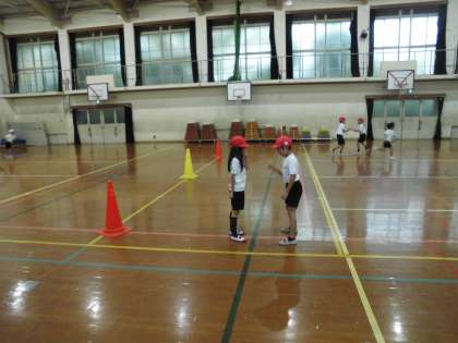 体育科の「とびあそび」で,うまくリズムを合わせて体を動かしています。チーム毎にどのように動けばいいのかを考え,楽しく対戦しながら,全員で楽しんでいます。