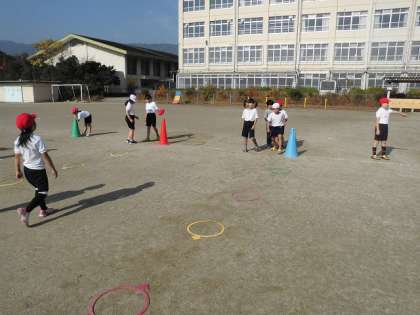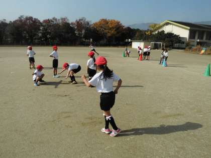 今日の体育はとびくらべ3時間目の学習でした。5歩とびくらべをしています。1,2,3,4は片足ずつ,最後の5歩目は両足で着地します。最初は5歩目でピタッと止まれなかったり,速く進むけれど遠くまで跳べなかったりしていましたが,3時間目となるとどの子も工夫して跳んでいました。1歩1歩ゆっくり,大股でが大事だと少しずつ理解してきている子どもたち。さすが2年生です。次回はより遠くまで跳べるようにがんばろう!