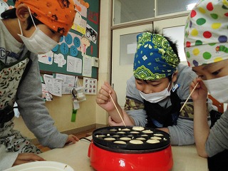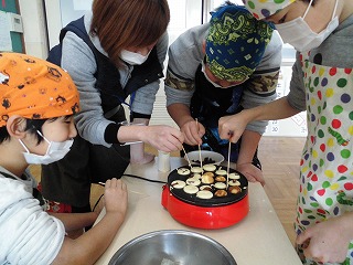 今日は,つくし学級でお楽しみ会の一つとしてクッキングをしました。たこ焼き器でベビーカステラを作りました。それぞれ材料の役割分担をして,たこ焼きのように竹串でひっくり返しました。「くるっと回して・・・。」,「上手いことひっくり返った!」,「まだまだ〜我慢。」と言って屋台のお店屋さんのようでした。
