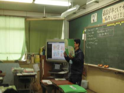 犬・猿・きじがそのばにいるかのように声の高さを変えてのパフォーマンス!すると子どもたちの表情も楽しそうに変わってくる。さらには教室が外国語がんばるぞという雰囲気になる。いいサイクルです。