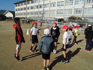 3年生の体育では,「エンドボール」をしています。ボールを持ったら動かない,友だちとパスをつないでゴールマンにボールをパスする。わかっていても,ボールをもらうと,ついつい動いてしますんです…。途中何回も,ルールを声に出しながら守ってプレイができました。ボールの行方をしっかり見ておかないと,パスがどんどんつながっていくので…わからなくなってしまいます。チームの友達と声をかけながら,ボールをつないで1点を目指そう!