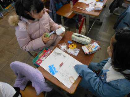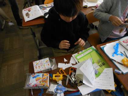 単元の最後の時間に,電気を通すものと通さないものを工夫したおもちゃを作ってみんなで遊びました。工作のようにひらめきで楽しい仕掛けを作って友だちと楽しんでいました。