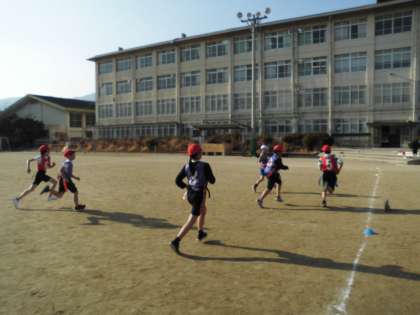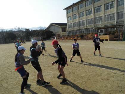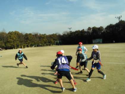 体育で「タグラグビー」を学習しています。初めて取り組む子が多く,なかなかルールを覚えるのが難しいようです。しかし,早くもチームの雰囲気を変えている子もいました。部活動で慣れている子が中心となって,チームのよさを引き出しているようです。