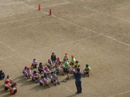 また,運動場を眺めれば6年1組も体育でタグラグビー。そしてふり返りで真剣に話し合っています。