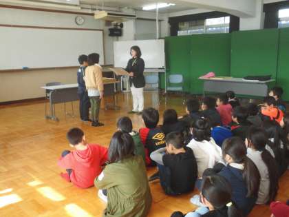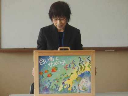 贈呈式の後,人権についての「白い魚とサメ」の紙芝居をしてくださいました。