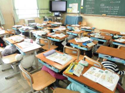 京都市一斉防災行動(シェイクアウト)訓練が行われました。一年生の子どもたちも地震による災害から身の安全を守るためにすばやく行動することができました。