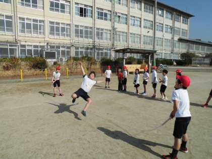 体育科で大なわをして,みんなで楽しく体動かしています。上手くタイミングに合わせてとぶのは難しく,引っかかってしまったとき,「ドンマイ!」という声でみんなでフォローし合っていました。みんなで上手になれるといいですね。。