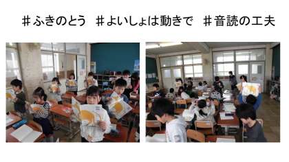 国語「ふきのとう」で音読の工夫を考えています。はじめの場面では,竹の葉っぱやふきのとうが出てきます。そこで,それらの人物をどのように伝えればよいか話し合いました。