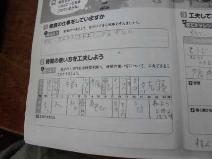 一年間の家庭科学習でできるようになったことを話し合い,来週一週間家の仕事を手伝うようにしました。