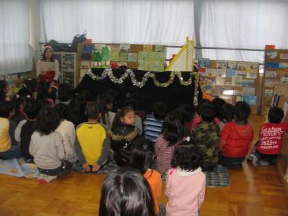 この日のおはなし宝石箱では,サンタさんからのお話のプレゼントがありました。「へんてこもりにいこうよ」というお話でくい入るように,前の舞台を見つめ,お話の世界に入り込んでいました。