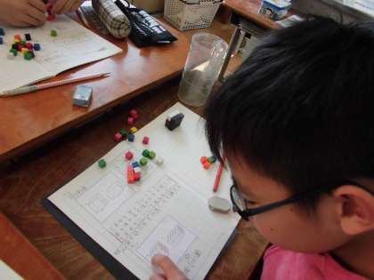 42個?36個?いやいや12個?違う,18個!どの答えが正しいのか悩んでいた子ども達でしたが,実際にブロックを操作することにより,「真」の答えにたどり着くことができました。頭だけでなく,体を使って体感することって大切ですね。