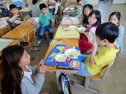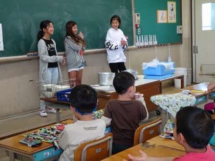 金曜日にも給食委員さんが来てくれました。今回も,1年生の子どもたちと楽しく話をしながら,時間以内に食べ終わるようサポートをしてくれたり,ごちそうさまの挨拶をしたりしてくれました。