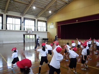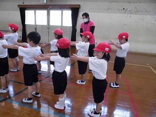 1年生では,並び方をしました。また,いろいろな歩き方をしました。太鼓のリズムに合わせて,ゆっくり歩くことや早く歩くことを頑張りました。「ぴよぴよちゃん!」,「なんですか?」,「こんなこと?こんなこと!できるかな?」,「できますよ!」できるかな?と先生の動きに合わせてジャンプしたり,踊ってみたり,体を動かすのがとっても楽しく活動できました。