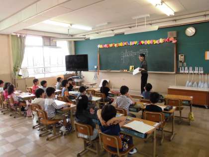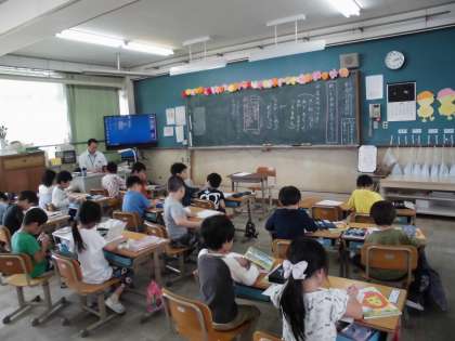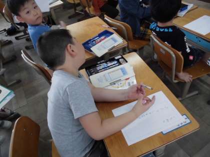 入学式から2週間がたちました。うしろから見た1年生の姿は,立派なものになってきました。1組では,家田先生のお手本をよく見て名刺作り!2組では,読書ノートを手に取り本読みについてのお話。みんなよくがんばっています。