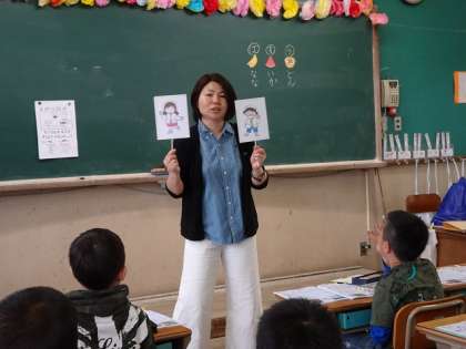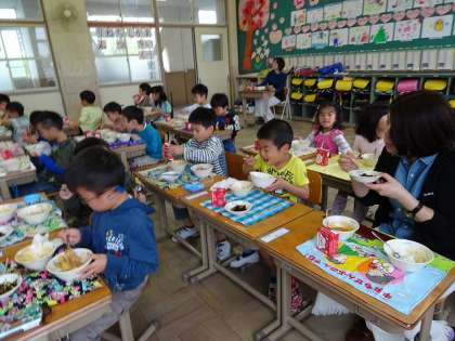 今日は1年2組に栄養教諭が来てくださりました。給食前の時間に,当番の身支度や準備について教えてもらいました。給食も栄養教諭と一緒に食べました。今日の給食はカレーだったので,みんなとっても喜んで味わいながら食べました。