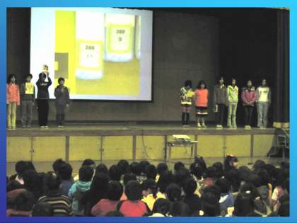 今日の児童集会では,図書委員が先日行なった「図書館のビフォーアフター」について全校児童に紹介しました。図書館のビフォーアフターは3・4年生が本を出し,5・6年生が分類番号順に本を入れていきました。学校支援ボランティアの方々と共に活動した様子を紹介しました。