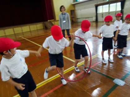 体育科では『てつぼうあそび』を学習中ですが,今日は突然の雨のため,急きょ体育館で『用具あそび』をしました。用具遊びではフラフープを使って,グループになってフープリレーをしました。