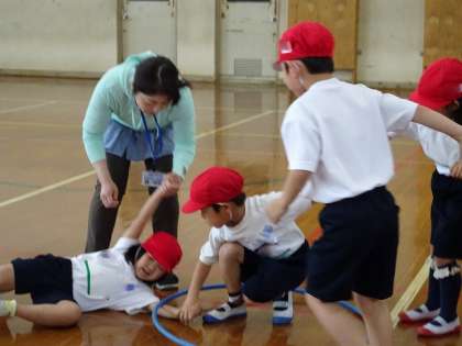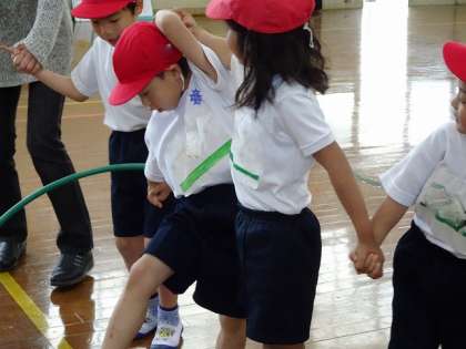 はじめは一人一人フープをくぐっていくだけでしたが,しゃがむとくぐりやすいことに気が付いて,どんどん上手に速くなっていきました。途中でグループごとの作戦タイムをして,並ぶ順番やくぐり方を相談して,協力しながらフープリレーを楽しみました。