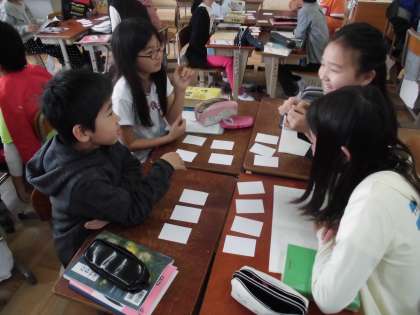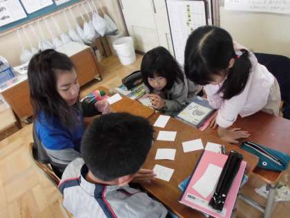 漢字を2つの部分に分けてカードに書き(「田」と「力」で「男」となるように…など),それを裏返して漢字が成り立つように当てていきます。そう!やり方は神経衰弱そのものです。ただ少し違って面白いのは,2つの部分が合わさって予想していたものと違った漢字ができてしまうこと!1回だけでなく,何回も挑戦していた子ども達でした。
