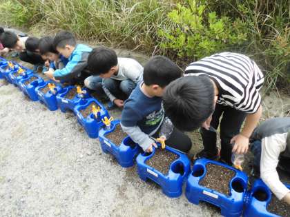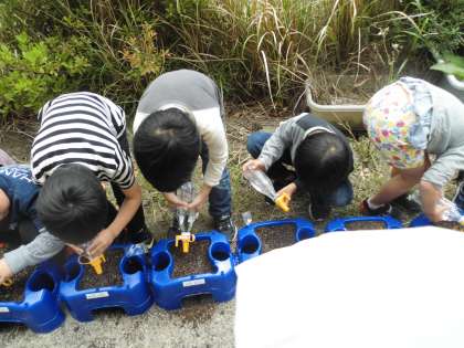 生活科のアサガオの種を植えました。子ども達は種を持つと,「とてもワクワクする。」といいい,自分の植木鉢の土つくりをした後,アサガオの種を植えました。その後,楽しそうに水やりをしていました。これから頑張って水やりをしていきましょうね。