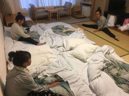 布団を敷いたり,ストレッチをしたり…。