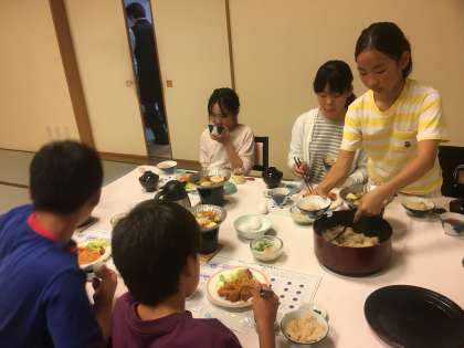 友達のご飯をよそってあげたり,お茶を入れてあげたり…。友達思いの姿がここでもみられました。友達と一緒に食べるご飯は最高です。