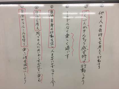 その結果,『他の人の気持ちを考えて自分の行動を正すことで、楽しい修学旅行につながる』というまとめになりました。
