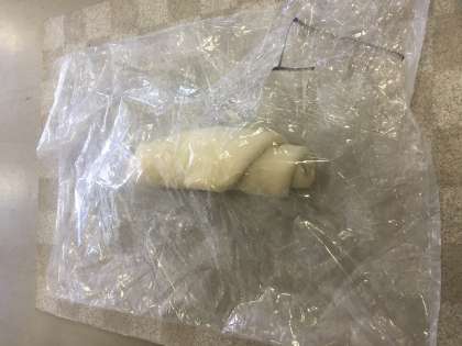 生地が伸びたら,ビニル袋から取り出しくるくる丸めて,また足で踏んでいきます。