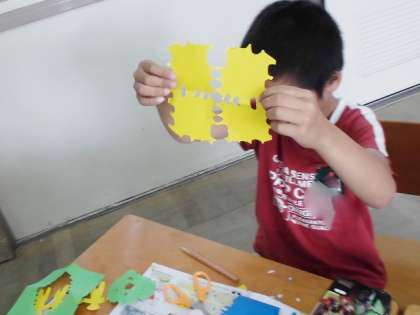 折って切って開くと,花のような形になったり,同じ形がいっぱいできたり……切り方を工夫して飾り作りを楽しみました。