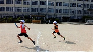 4年生でリレー学習をしています。バトンの渡し方はどうしたらいいのか…バトンの渡し方を意識して練習をしました。