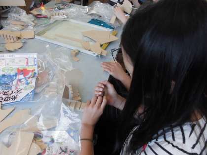 図工の「糸のこスイスイ」では,組み立ても少しずつ始まってきました。「こっち向けにしたらいいかな?」「ここ接着剤でくっつけて…」。子どもたちの想像力はどんどん広がります。絵の具をつけたらどんな作品になるのか楽しみです。