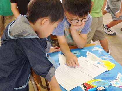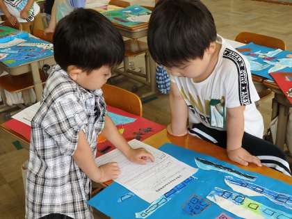 はじめに,自分の絵の頑張ったところをプリントに書いて,それを机に置いてから友だちの絵を見て回りました。みんな,友だちの絵を見るだけではなく,頑張ったポイントを一生懸命読みながら,じっくり鑑賞できました。