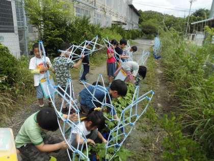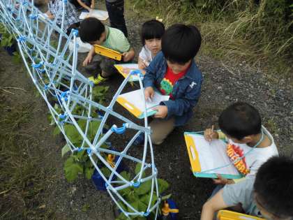 生活科で観察しているアサガオが大きくなってきました。上手にアサガオの葉をよけながら支柱を鉢につけ,アサガオの観察をしました。子ども達は,「すごく大きくなったよ!」ととても喜んでいました。これからも水やりをがんばってくださいね。