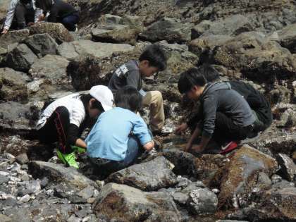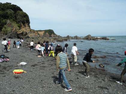 明日の天気が心配なので、午後の活動の前に急きょ宮崎浜へ行くことになりました。万が一、明日、田尻浜での磯観察ができない場合に備えて、短い時間でしたが、太平洋の大海原を見てきました。