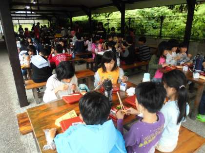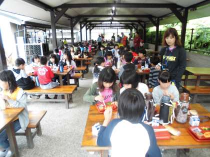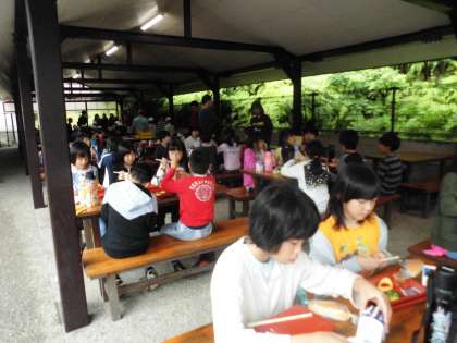 朝のつどいの後、野外炊事場で朝食をいただきました。