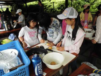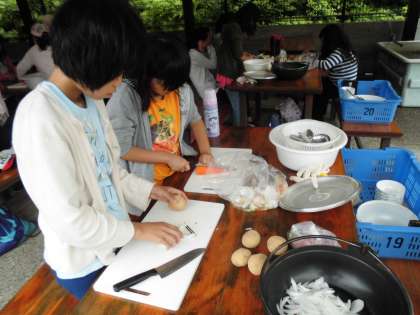 昼食は、カレーを自分たちで作ります。事前に学校で一度練習したとはいえ、4年生にとって、カレーの調理はなかなか難しいです。包丁を使って、ジャガイモ、ニンジン、玉ねぎを準備しました。