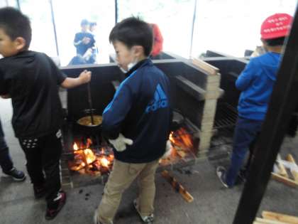 材料が準備できたら、火の係の出番です。おいしいカレーが煮込めるように上手に火力を調整しなければなりません。風向きによっては、煙がまともに目に入り、痛い痛い。