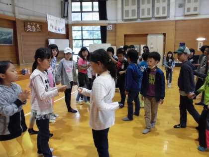 野外炊事の後は、田尻浜での磯観察の予定でしたが、波が高い状態が続いていたので、活動内容を変更しました。それまでに少し時間があったので、プレイホールでのリラックスタイムとしました。男女仲良く、思いっきり体を動かすことができました。