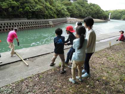 田尻浜での磯観察の代わりに、地元の漁師さんが実際にされているかご漁を体験させてもらいました。深谷水道にみさきの家の所員さんが仕掛けておいてくださったかごを班ごとに引き上げる体験です。