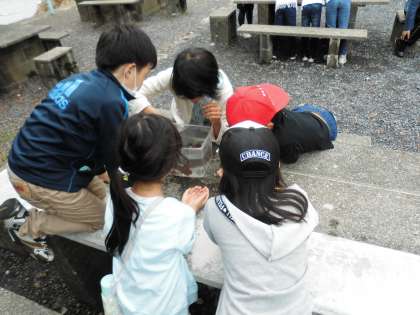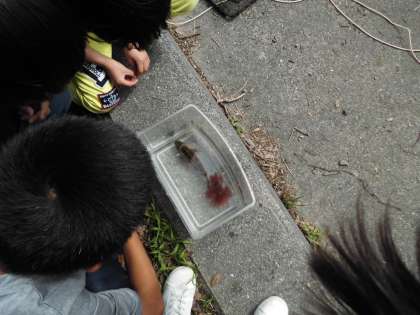 かご漁でゲットした生き物を水槽に入れて、観察したり、実際に手で触れたりすることができました。磯観察はできなかったけれど、色々な魚や海の生き物に身近に触れることができて、子どもたちは大喜びでした。