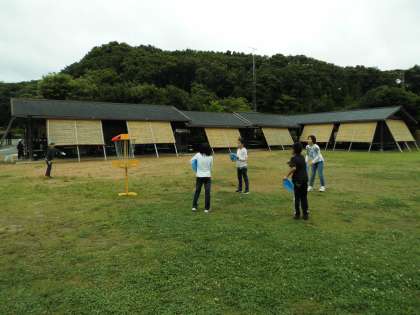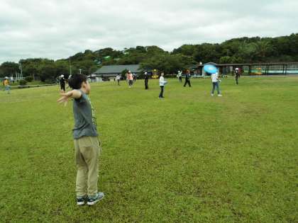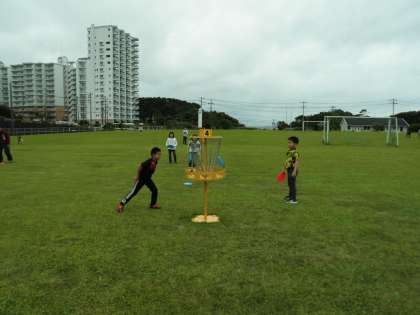 ミニ水族館で生き物に触れ合った後、芝生広場でフライングディスクゴルフに挑戦しました。所内に9ホール設定されているコースを班で順番にまわりました。
