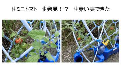 ミニトマトできました。発見できました。とってもいい色のミニトマト。うれしい報告です。赤い実ができているのをとっても嬉しそうに言ってくれる子の表情は,最高に美味でした!