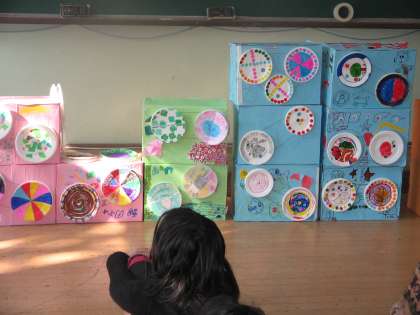 つくし学級では,小さな巨匠展に向けて,竹の里小学校で「まわしてあそぼう」というテーマで,大原野小学校・竹の里小学校・上里小学校のお友達と紙皿を使って工作を楽しみました。この工作は,ゴムでつながっていて,ひとつのお皿を回すともうひとつのお皿も回ります。お皿がどんどん回ってとってもきれい。みんなで楽しくまわして遊びました。