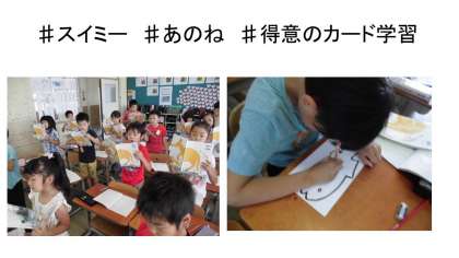 国語「お話を読んで,かんそうを書こう」スイミーの学習が展開していっています。今日から螺旋的・反復的な学習の始まりです。昨日,感想文の書き方ポイントをみんなでまとめたので,そのミニ版で「スイミーあのね」カードを登場させて学習を進めています。どんな内容かとても楽しみですね!