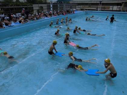 だるま浮きや大の字浮き,水中じゃんけん,クロール練習と,いろいろなことにチャレンジしています。水中にいるだけで子ども達はにこにこです。