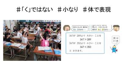 算数でも体を動かす!「く」ではありません!「小なりです。」算数の数くらべでは,新しく「大なり」「小なり」が登場しました。すごく便利なものですが,覚えることが難しい。だからこうやって活動します!
