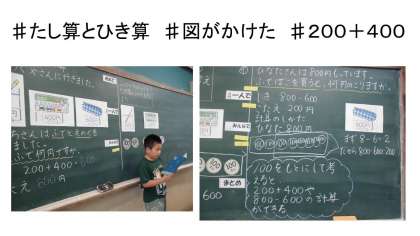 算数「たし算とひき算」のようすです。今日は「200+400」「800−600」の計算の仕方を考えました。もう慣れてきたのか,みんなスラスラ説明を書き,お話してくれます。